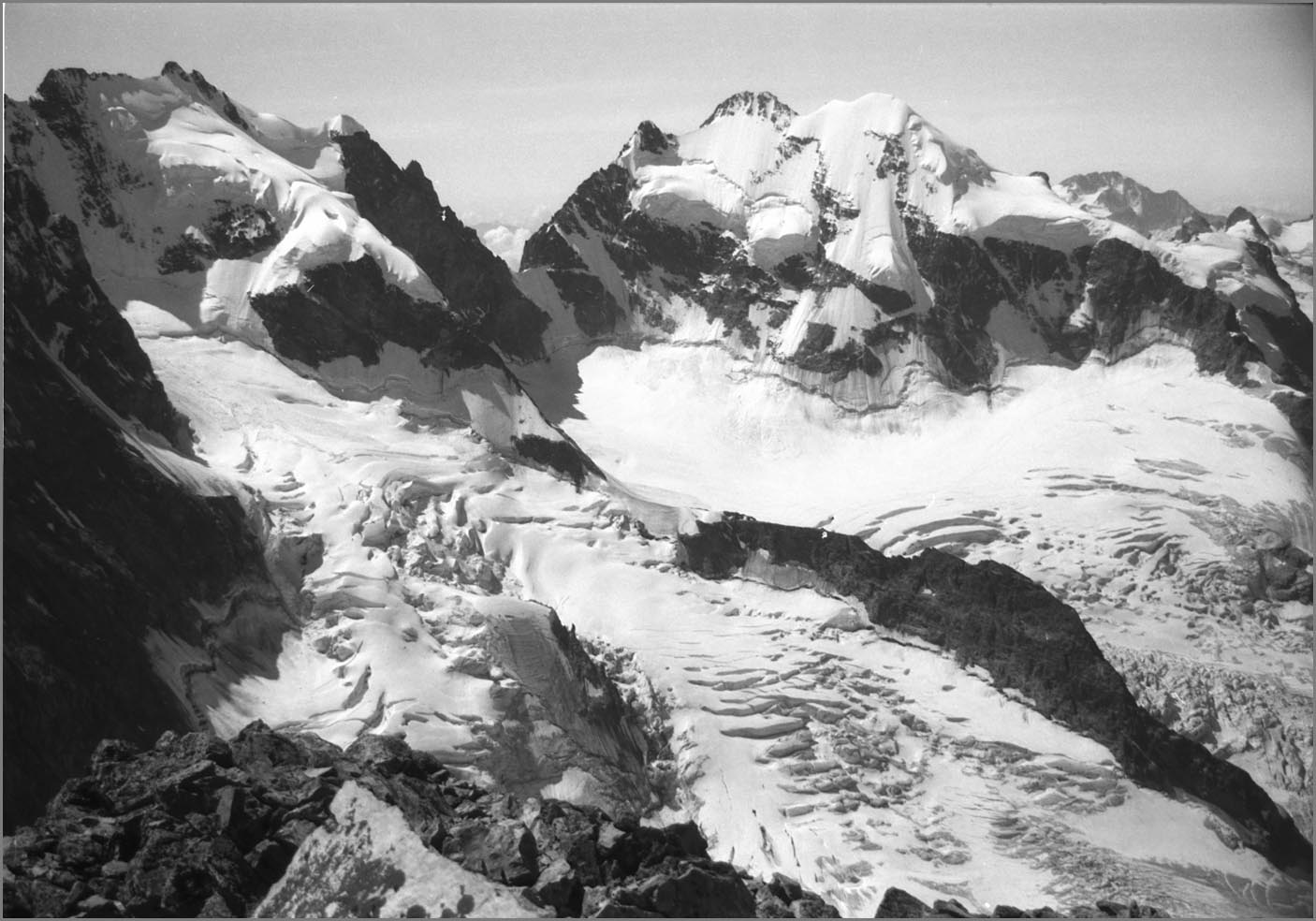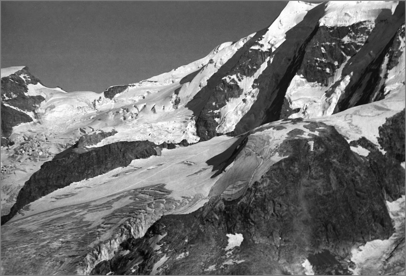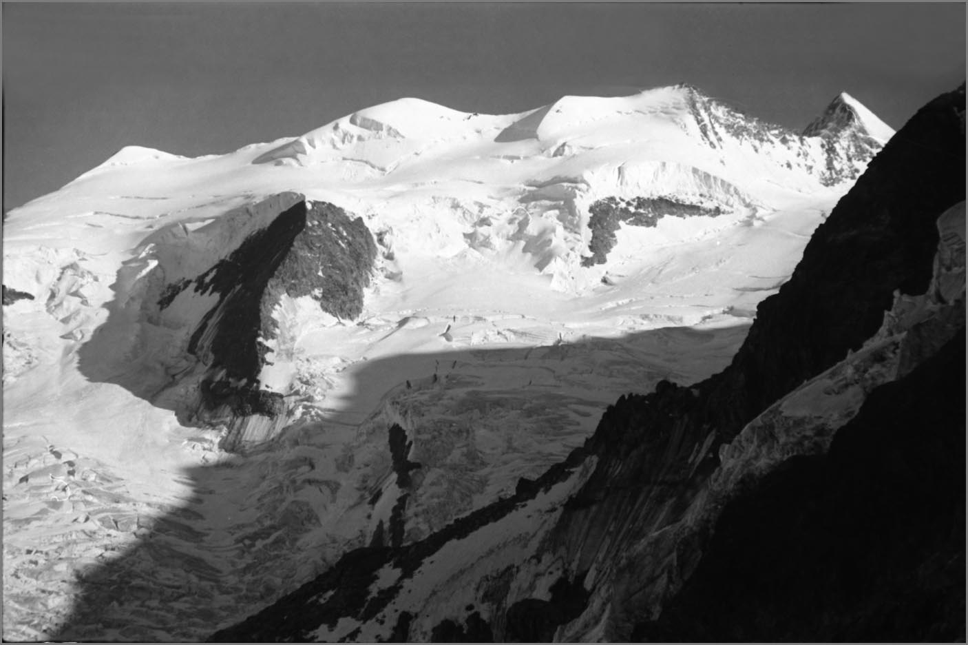 Morteratsch 1896 m > sur sem da boval über dem morteratschgletscher > vorbei an der chapanna da boval 2495 m > vadret boval-daddains (biwack unter freiem himmel) > fuorcla da boval 3347 m > piz morteratsch 3751 m > vadrettin da tschierva > vorbei an der chapanna da tschierva 2583 m > val roseg > pontresina