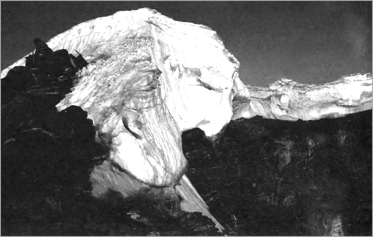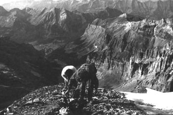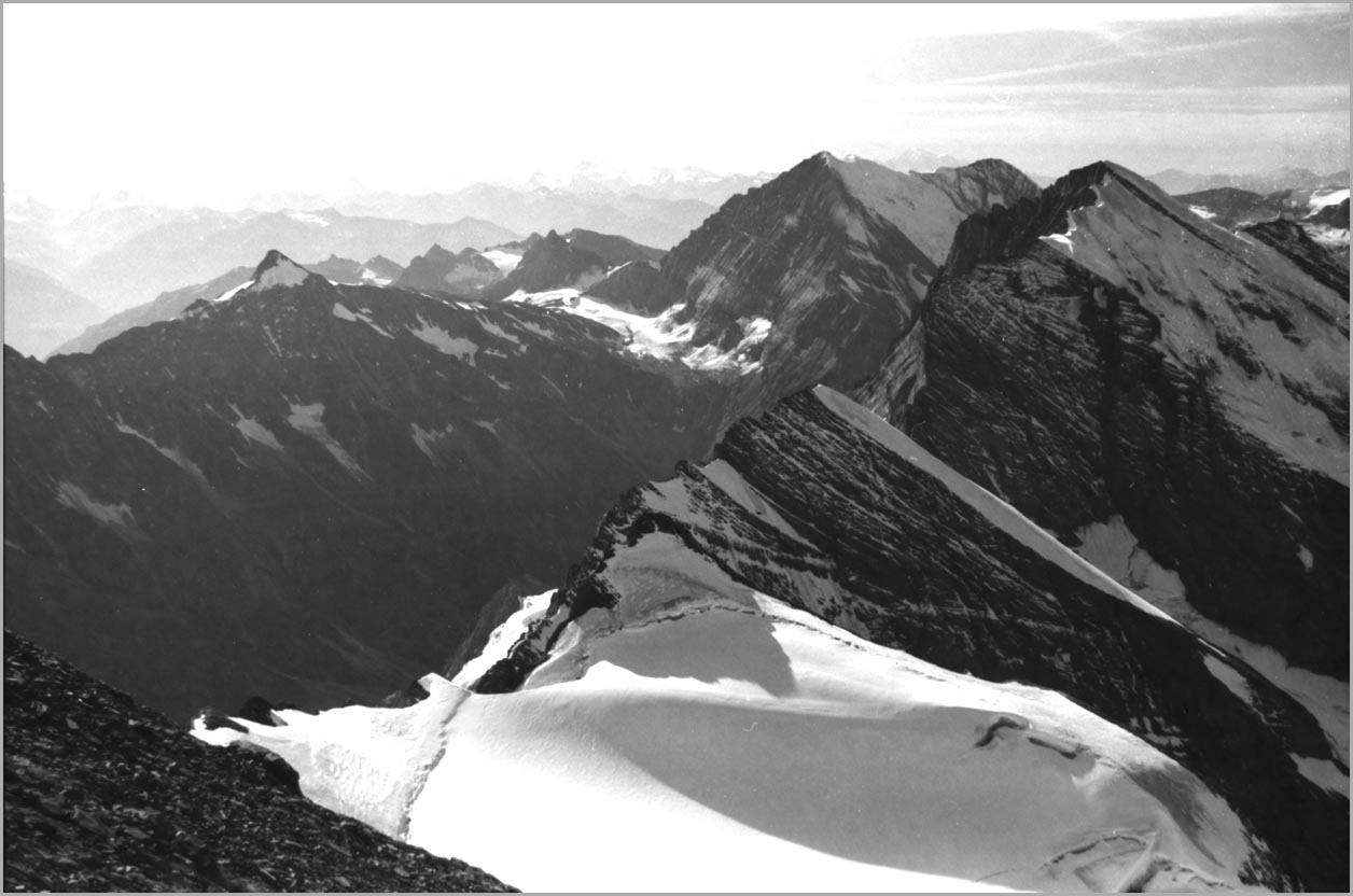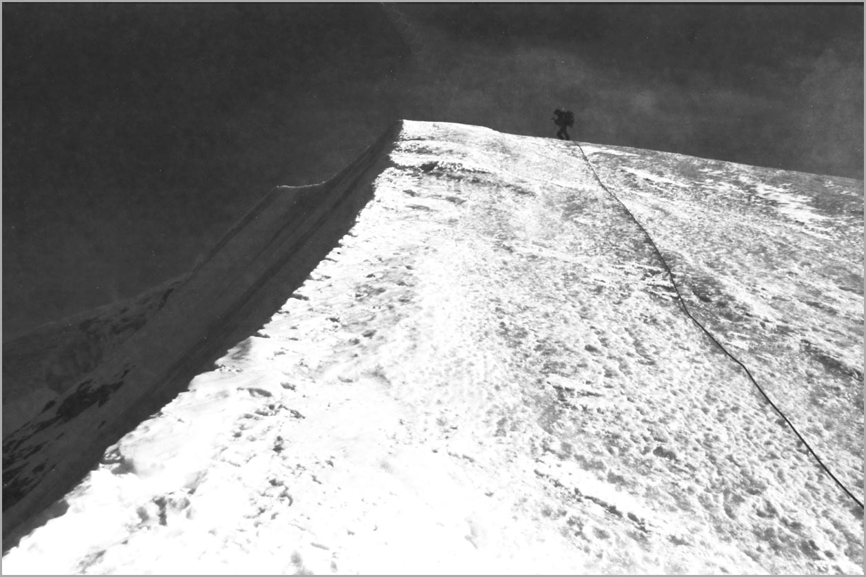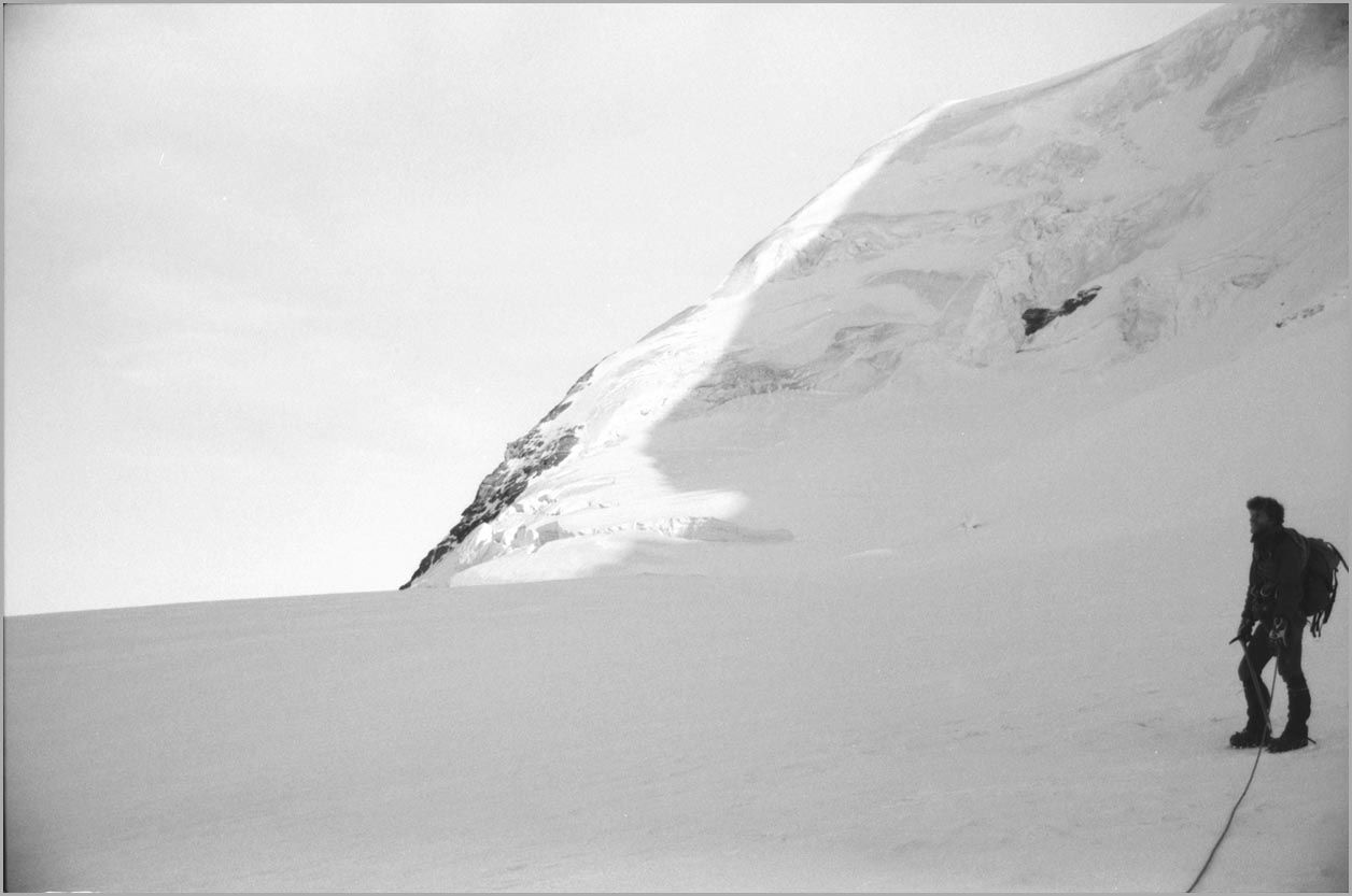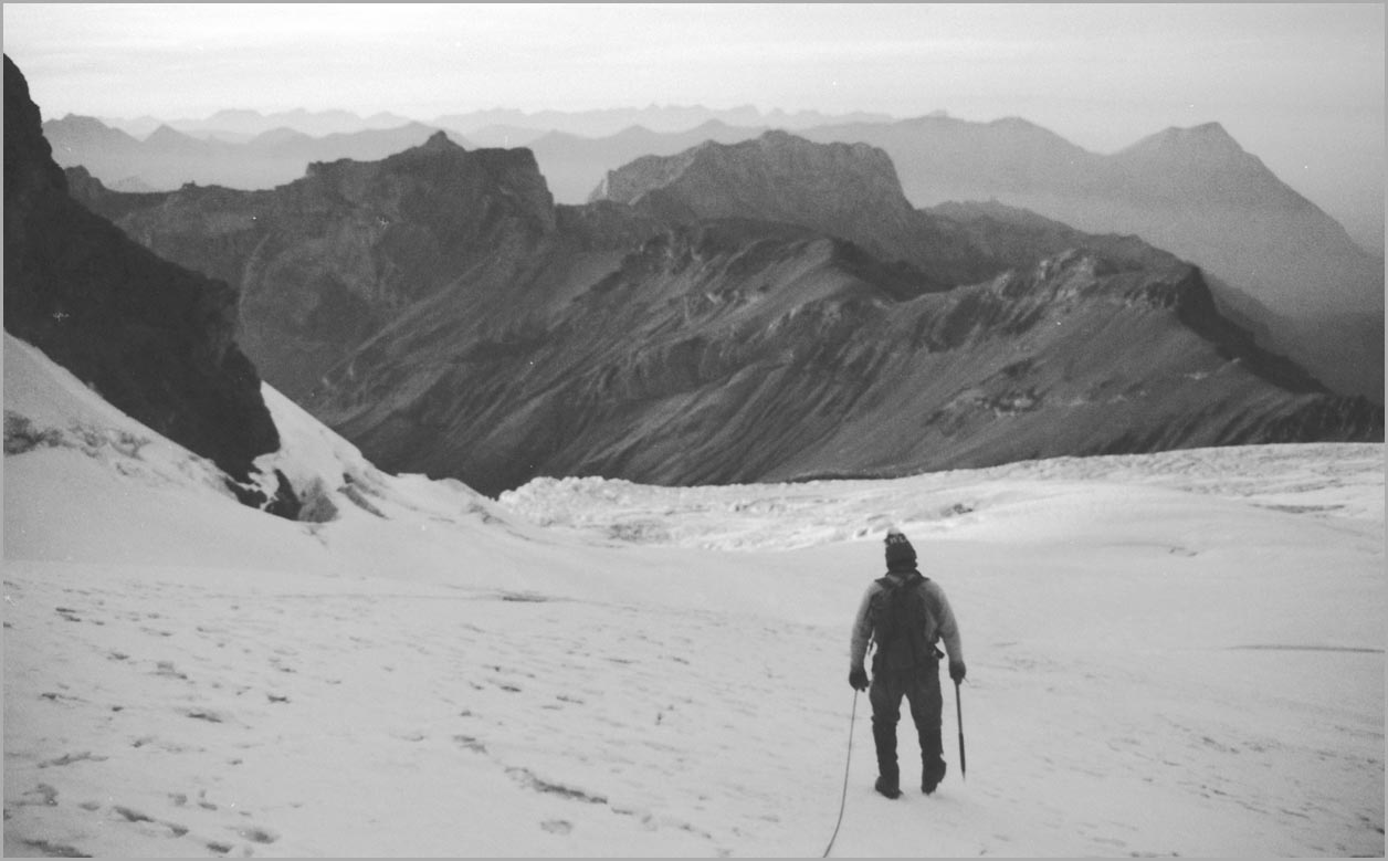 kandersteg 1176 m > öschinensee > blümlisalphütte 2840 m > rothornsattel > blümlisalphorn 3664 m > retour fußnote: die tour gilt als winterbegehung (11/85 !), obwohl in diesem jahr noch kein schnee gefallen war: sonst problemlose firnaufstiege waren rampen aus blankeis und/oder brüchigem fels. (ausserdem ging bei der entwicklung der filme gehörig etwas schief.) blümlisalphorn - 11/85 ![]() |