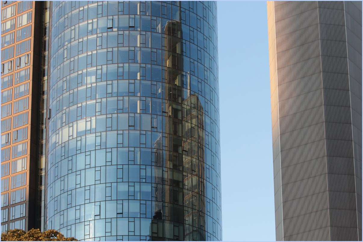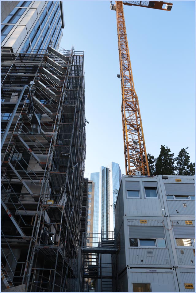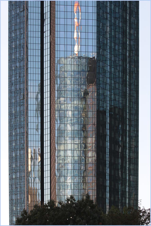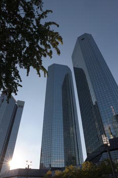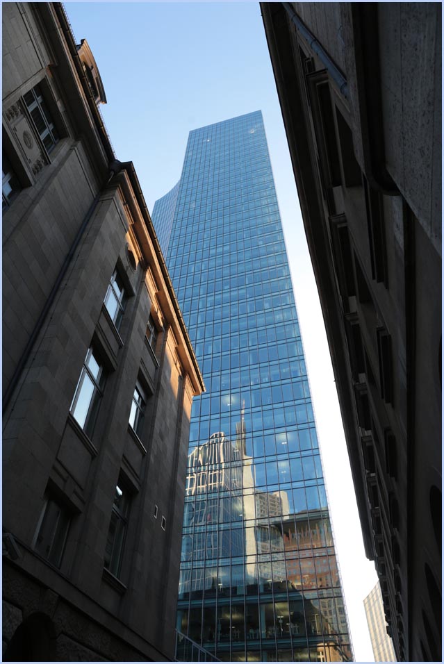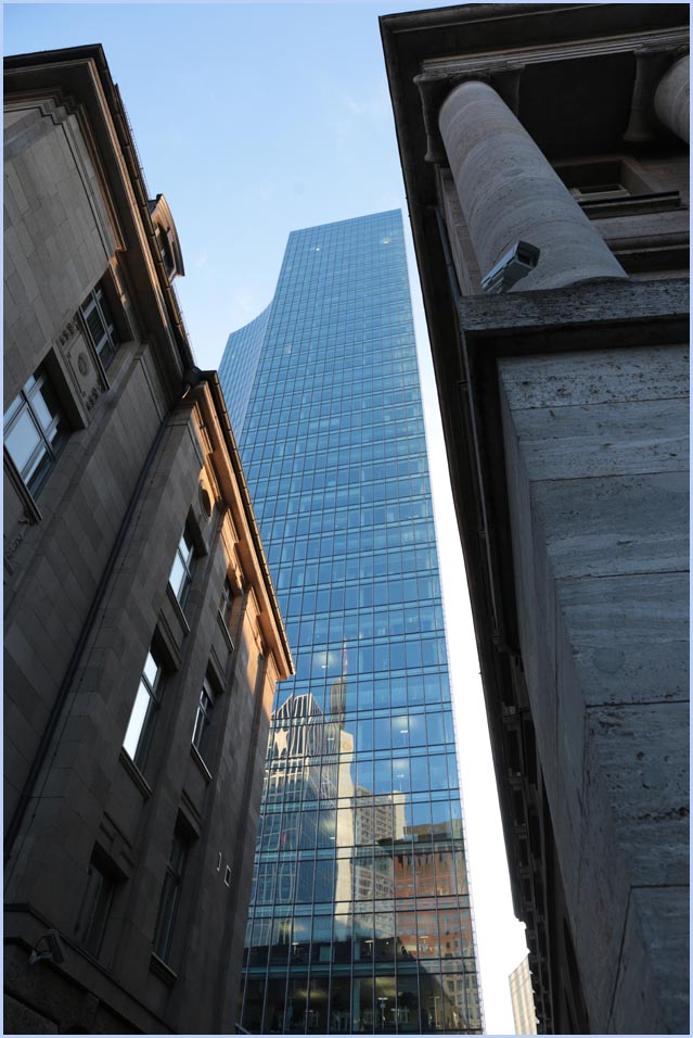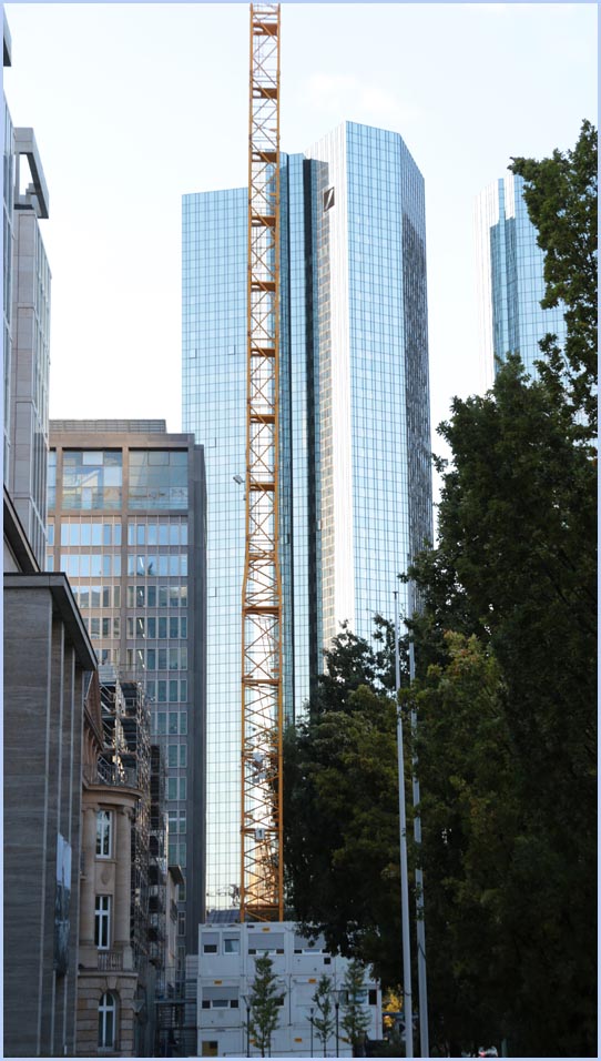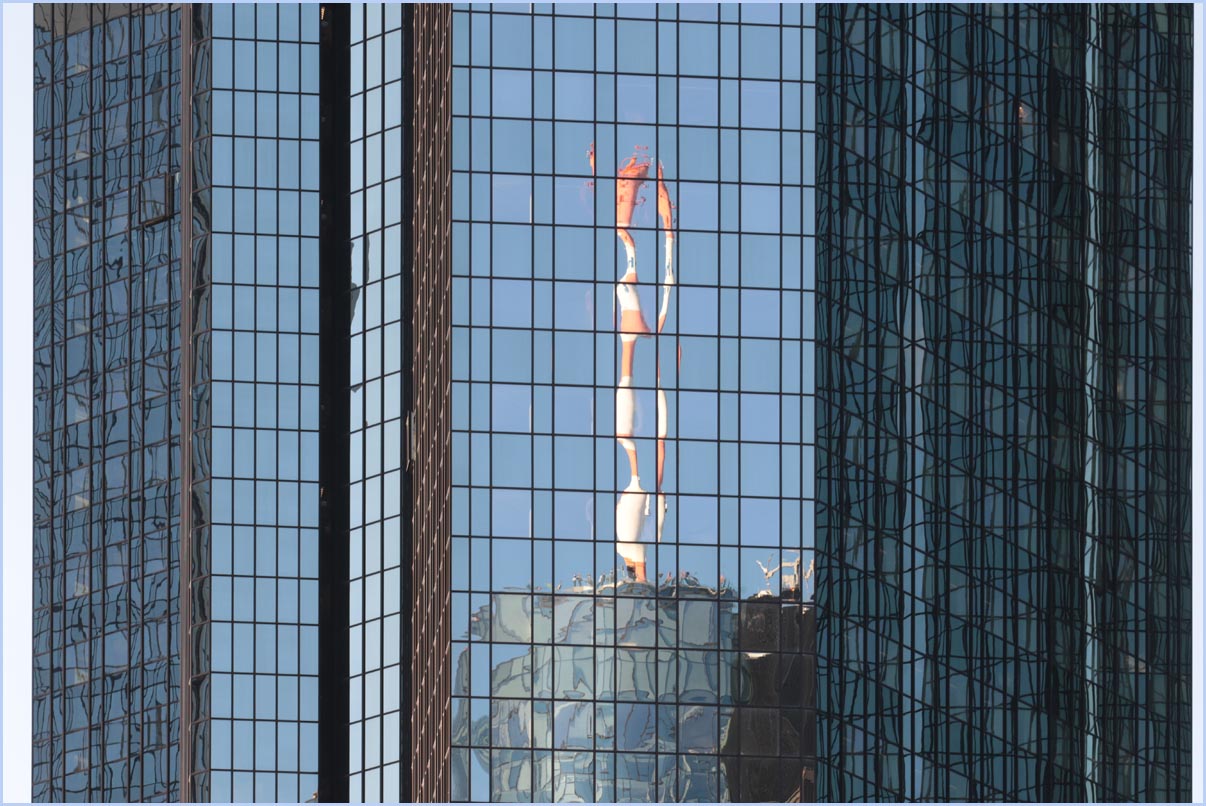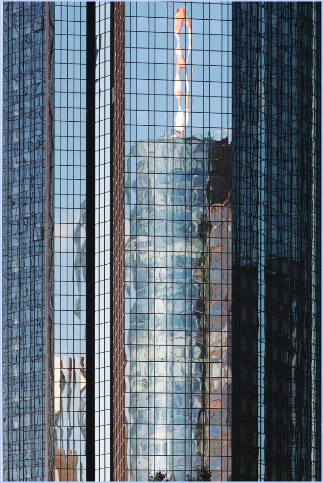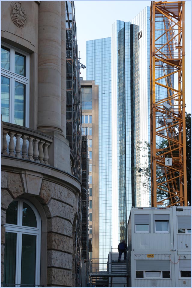 (Selbst)kritik des fotografen: Historisch stehen die höchsten und grössten Bauwerke in unseren städten für politische und/oder ideologische macht - kirchen schlösser, burgen. Dass die höchsten gebäude in unseren heutigen städten banken sind, versteht sich daher von selbst. Sie aber auf ein dekoratives und rein ästhetisches objekt zu verkürzen, ist reichlich unangemessen und naiv. Denn es gibt eigentlich nur zwei angemessene verhaltensweisen - auch das lässt sich historisch belegen - angesichts von herrschaftsarchitektur: vor ihr niederknien und sie anbeten - oder plattmachen. Oder will jemand im ernst behaupten, diese türme stünden für eine selbstbewusste demokratische gesellschaft? Blosses - scheinbar neutrales - fotografieren kommt jedenfalls dem anbeten sehr nahe, schliesslich handelt es sich ja nicht um historische denkmäler eine vergangenen epoche. Noch nicht. |