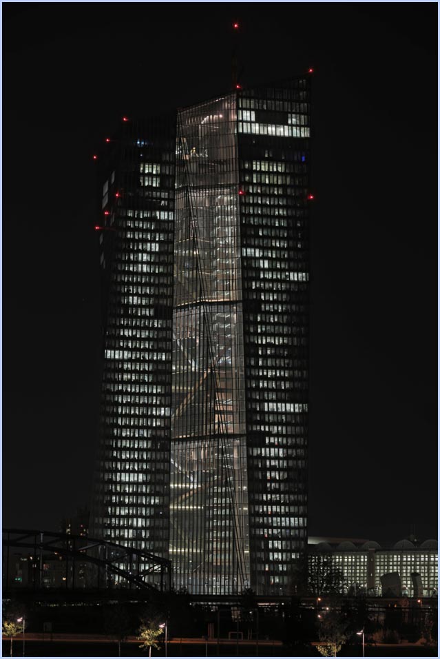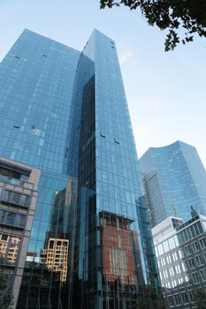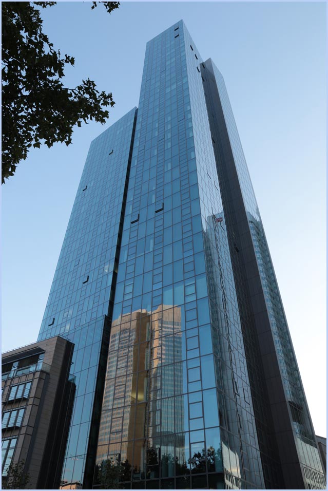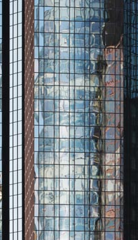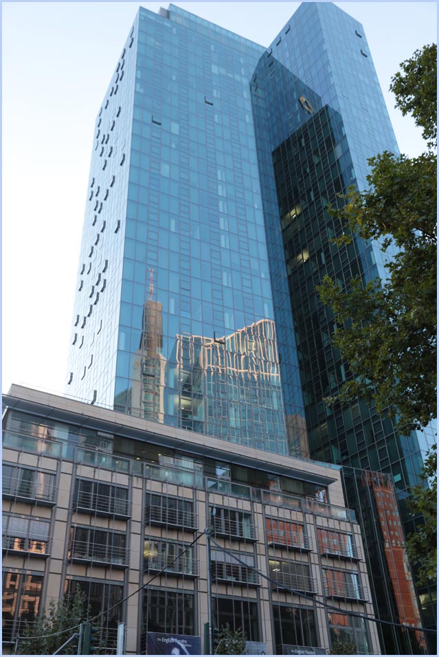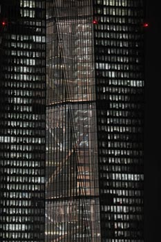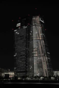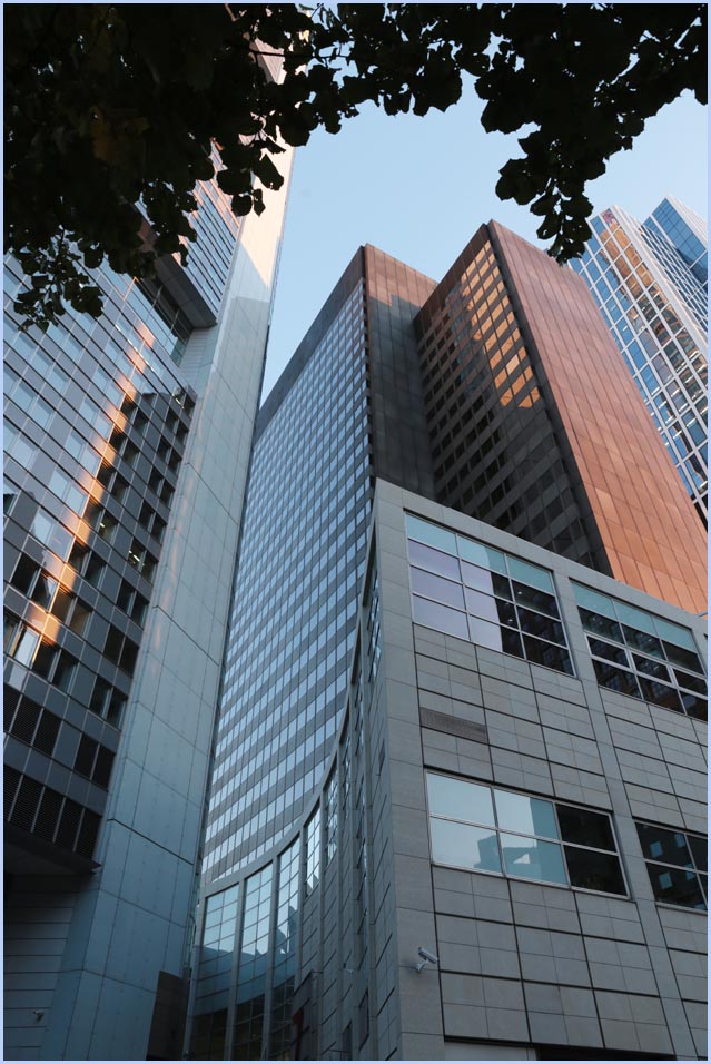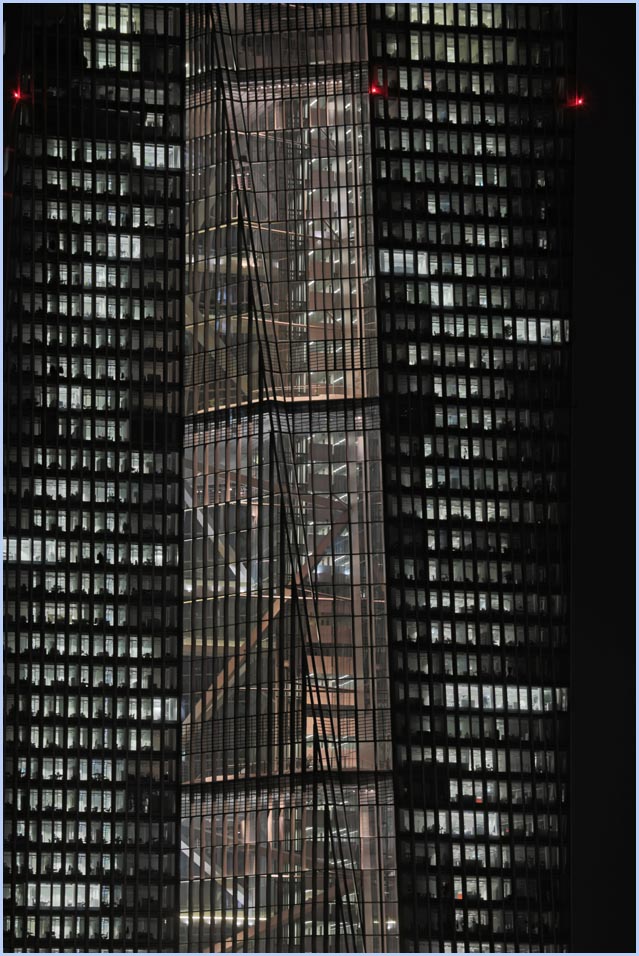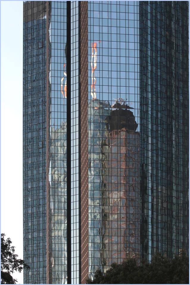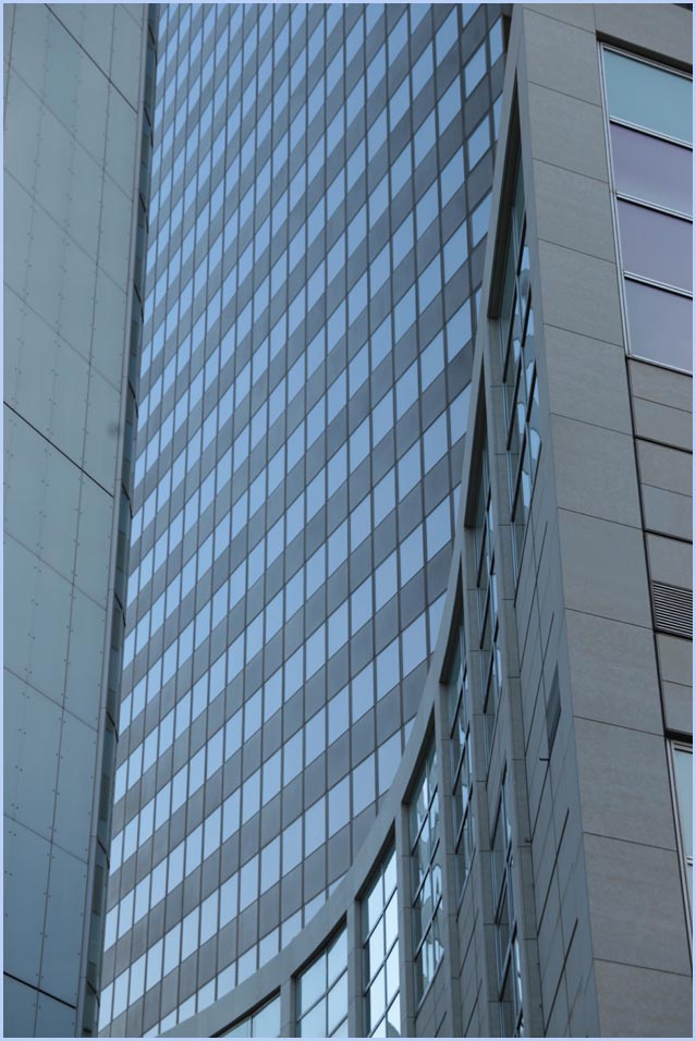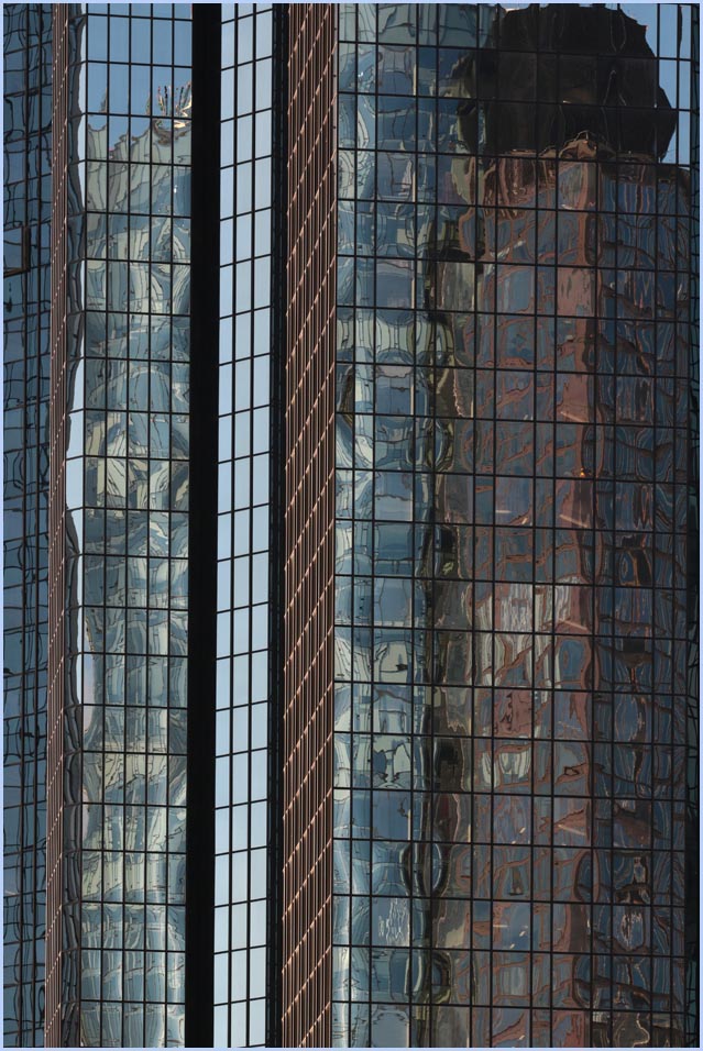 (Selbst)kritik des fotografen: Historisch stehen die höchsten und grössten Bauwerke in unseren städten für politische und/oder ideologische macht - kirchen schlösser, burgen. Dass die höchsten gebäude in unseren heutigen städten banken sind, versteht sich daher von selbst. Sie aber auf ein dekoratives und rein ästhetisches objekt zu verkürzen, ist reichlich unangemessen und naiv. Denn es gibt eigentlich nur zwei angemessene verhaltensweisen - auch das lässt sich historisch belegen - angesichts von herrschaftsarchitektur: vor ihr niederknien und sie anbeten - oder plattmachen. Oder will jemand im ernst behaupten, diese türme stünden für eine selbstbewusste demokratische gesellschaft? Blosses - scheinbar neutrales - fotografieren kommt jedenfalls dem anbeten sehr nahe, schliesslich handelt es sich ja nicht um historische denkmäler eine vergangenen epoche. Noch nicht. |